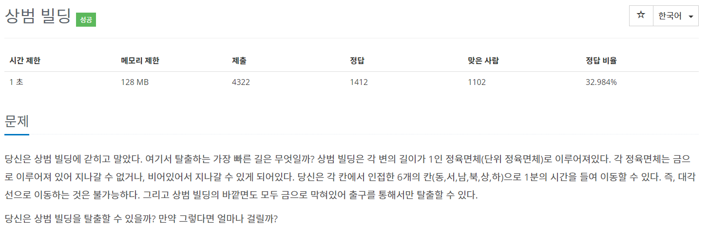 문제 당신은 상범 빌딩에 갇히고 말았다. 여기서 탈출하는 가장 빠른 길은 무엇일까? 상범 빌딩은 각 변의 길이가 1인 정육면체(단위 정육면체)로 이루어져있다. 각 정육면체는 금으로 이루어져 있어 지나갈 수 없거나, 비어있어서 지나갈 수 있게 되어있다. 당신은 각 칸에서 인접한 6개의 칸(동,서,남,북,상,하)으로 1분의 시간을 들여 이동할 수 있다. 즉, 대각선으로 이동하는 것은 불가능하다. 그리고 상범 빌딩의 바깥면도 모두 금으로 막혀있어 출구를 통해서