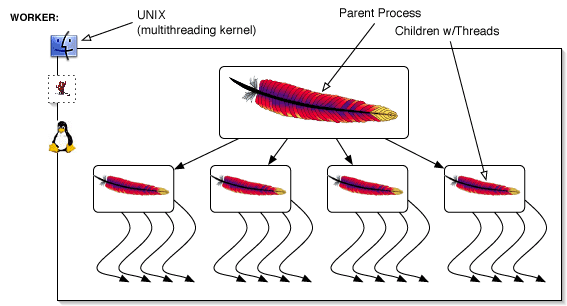 Prefork와 달리 하나의 자식 프로세스 안에 여러개의 스레드를 사용하고있고 각 요청은 각 스레드에서 처리하게된다. 프로세스 하나의 제한된 스레드 개수가 있는데 그 스레드 수를 넘어가면 새로운 자식 프로세스를 생성해서 처리하게 된다. Prefork 처럼 요청당 프로세스 하나가 아니라 메모리가 절약된다는 장점이 있다. 때문에 Prefork보다 부하 위험성이 덜하다.