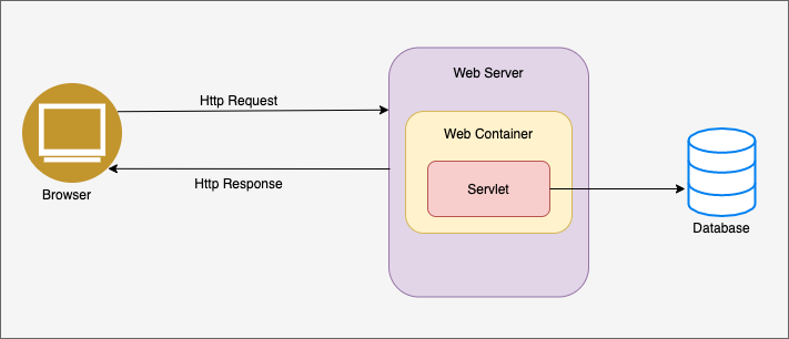 - 서버는 컨테이너에 있는 서블릿으로 요청에 대한 서비스를 수행한다